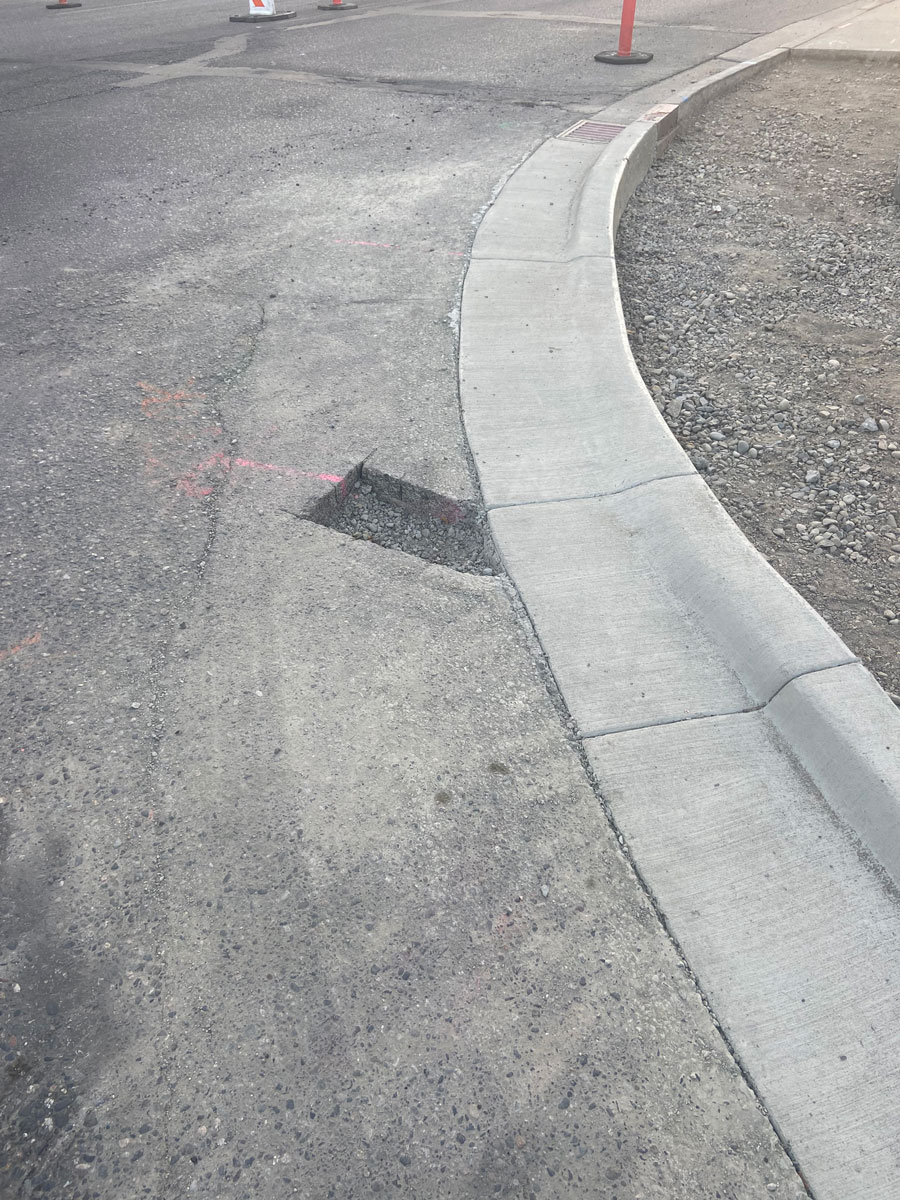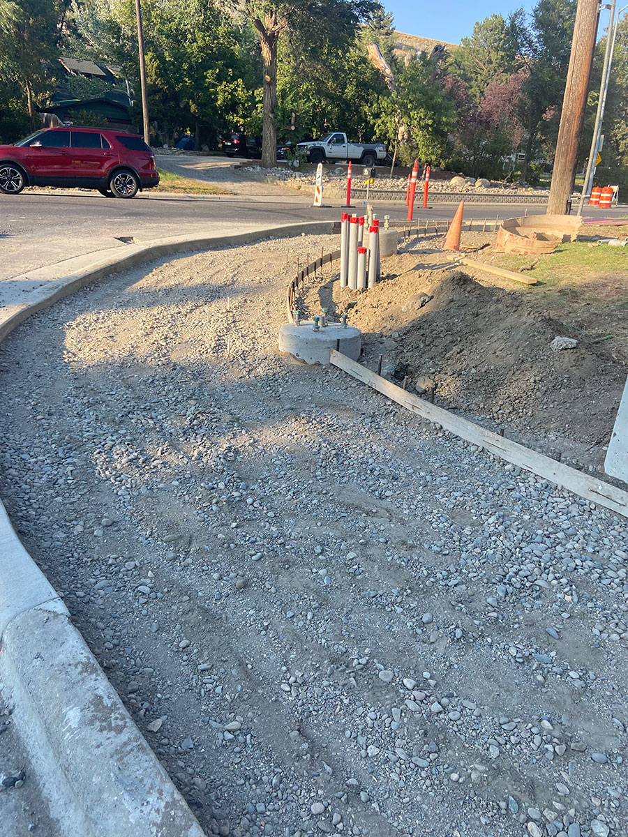 Curb and corner improvements at a high-traffic intersection, requiring careful coordination, schedule control, and attention to public safety and traffic flow.